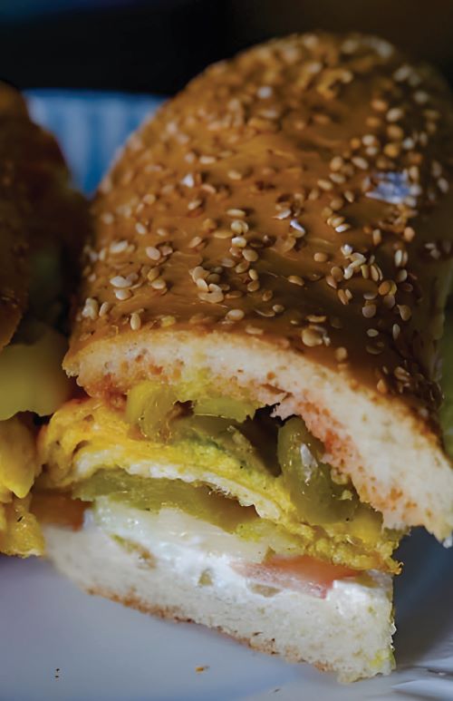 Contains sliced hard boiled eggs, cream cheese olives and tomatoes.