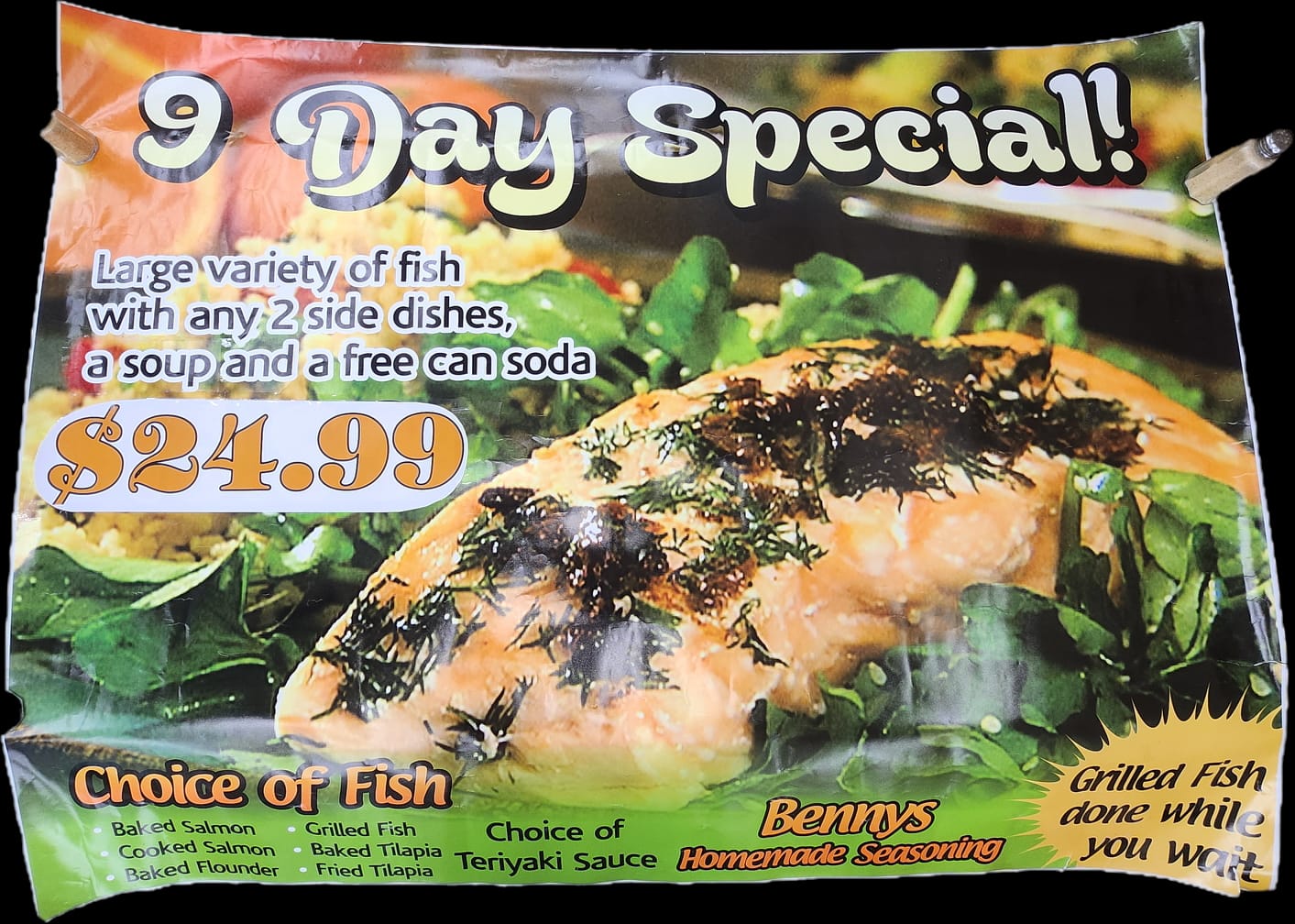 Large Variety of Fish with any 2 Side Dishes, Soup and a free Can of Soda.